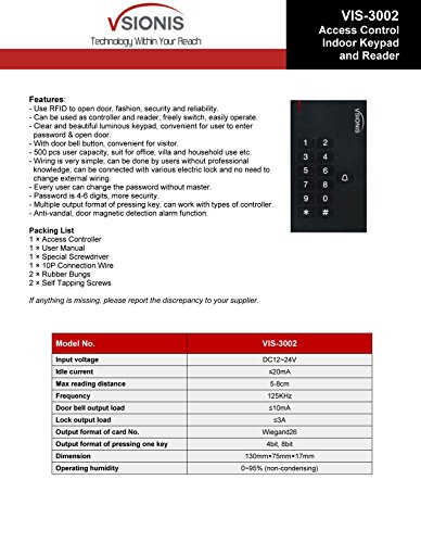 (1) VIS-3002: Access Control Indoor Keypad and Reader Standalone, 500 users with internal doorbell