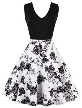 KILLREAL Women's Vintage Floral Print V Neck Sleeveless Cocktail Swing Dresses Black Small