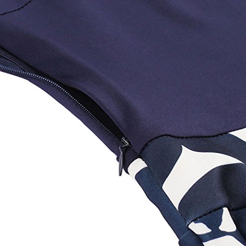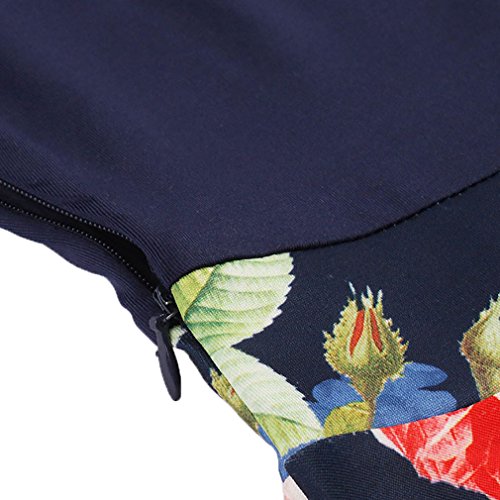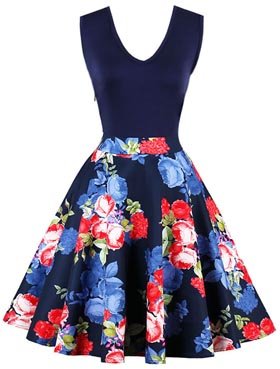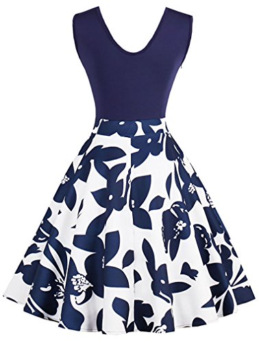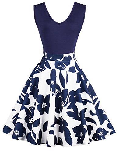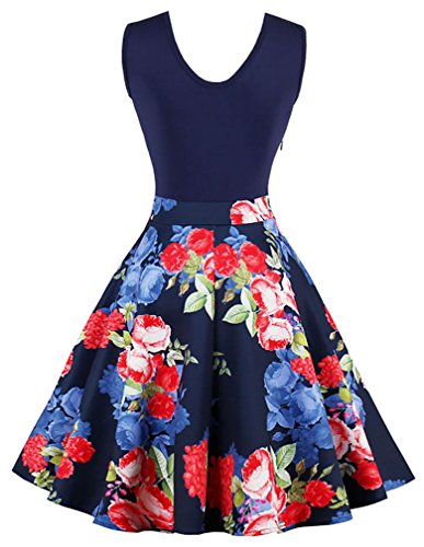 KILLREAL Women's Vintage Floral Print V Neck Sleeveless Cocktail Swing Dresses Dark Blue Medium