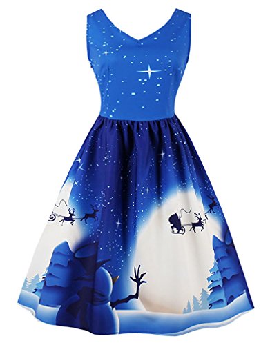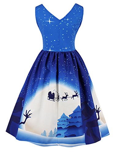 KILLREAL Women's V-Neck Sleeveless Reindeer Printed Vintage Swing Dress for Christmas Party Blue Medium