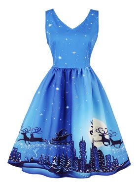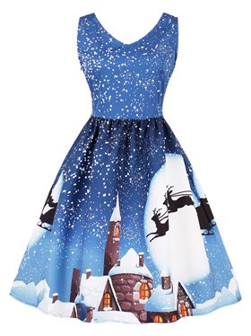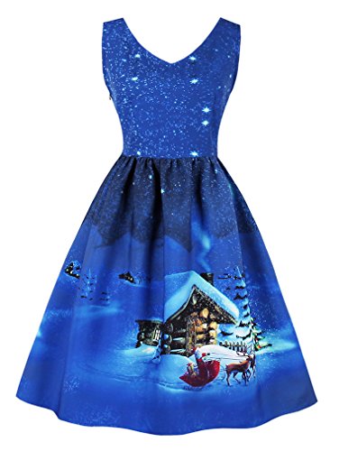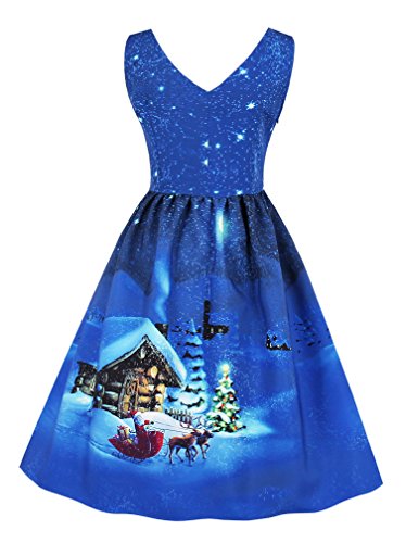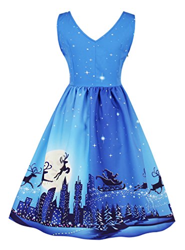 KILLREAL Women's V-Neck Sleeveless Reindeer Printed Vintage Swing Dress for Christmas Party Blue Large
