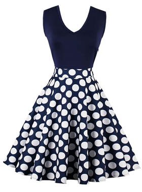 KILLREAL Women's Vintage Floral Print V Neck Sleeveless Polka Dot Cocktail Swing Dresses Dark Blue Small