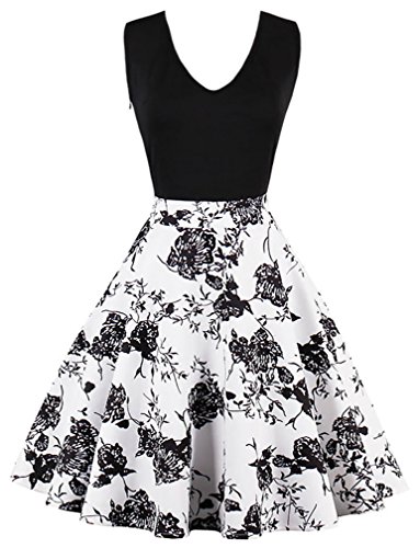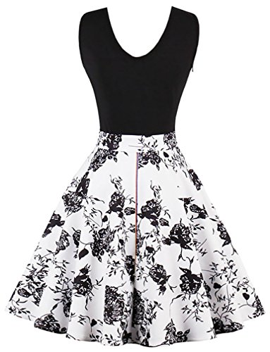 KILLREAL Women's Vintage Floral Print V Neck Sleeveless Cocktail Swing Dresses Black Medium