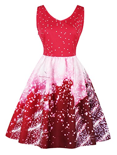 KILLREAL Women's V Neck Sleeveless Christmas Tree Printed Flared Cocktail Party Dress Red Medium