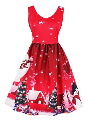 KILLREAL Women's Cute Reindeer Printed Knee Length Christmas Party Fancy Cocktail Dress Red Large