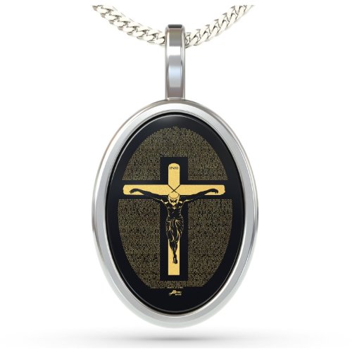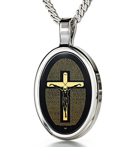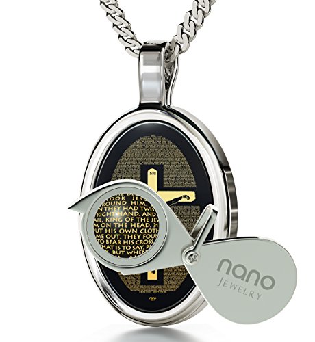 -. Feature : Crucifix Necklace inscribed in 24K gold with Matthew 27 in miniature text. A magnifying glass is included for you to truly admire your new jewelry. / A 925 sterling silver, high quality, Italian chain measuring 18", 45cm, elegantly suspends from the onyx gemstone, 0.6x0.8" (15x21mm). The pendant is set in a 925 sterling silver frame and the chain fastens with a classic sP.R.Ing ring clasp. / Mathew 27, known as one of the most sacred bible chapters, makes a unique jewelry gift idea for any occasion, whether it be a Christmas gift, anniversary gift or religious gift. This necklace aims to inspire faith and devotion with an intricate design, making it sure to impress that special person in your life who values their sacred faith. Highlight their virtue or your own with this perfect gift of the holy spirit. / This unique pendant arrives in an elegant jewelry gift box ready for giving or receiving. / All the Nano Jewelry collection is created using innovative "never seen before" technology, enabling us to inscribe the smallest of text and details in 24k gold over the surface of stones, sometimes miniscule to the naked eye.