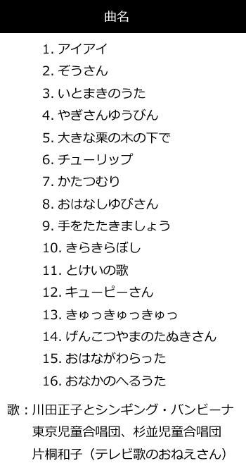 「アイアイ」「ぞうさん」「いとまきのうた」他、子供から大人まで、みんなに愛される定番の童謡がはいったアルバムです!