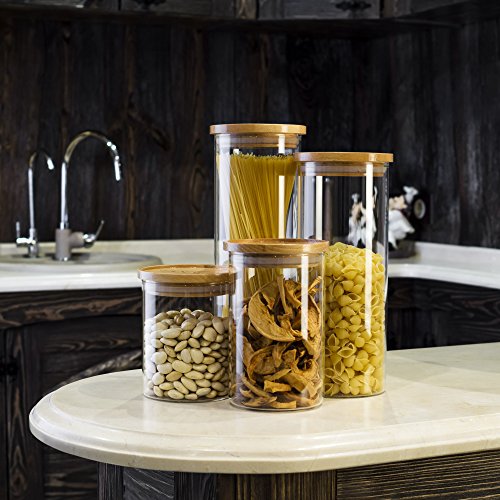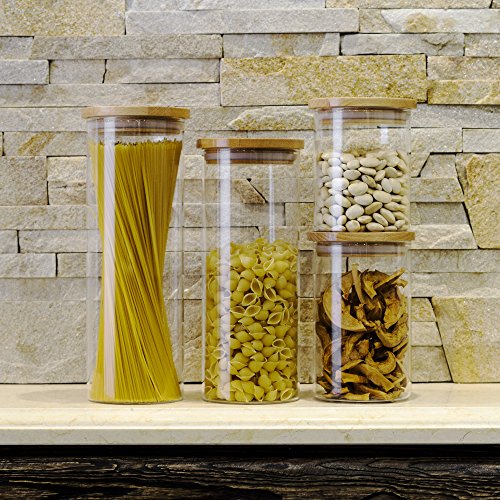 - ✔️SAFE AND ECO-FRIENDLY MATERIALS: Made from strong borosilicate glass with airtight silicone seal and bamboo lid, these canisters are perfect for pasta, tea, coffee, beans, cereal, flour, sugar, rice, nuts, dry fruits, herbs, spices, biscuits and more! 54.1 fl oz jar (the biggest canister - PLEASE CHECK THE CAPACITY YOU ARE SELECTING) is ideal for spaghetti. Your favorite food stays fresh for longer. Materials of the canisters were chosen to ensure minimum environmental effect.