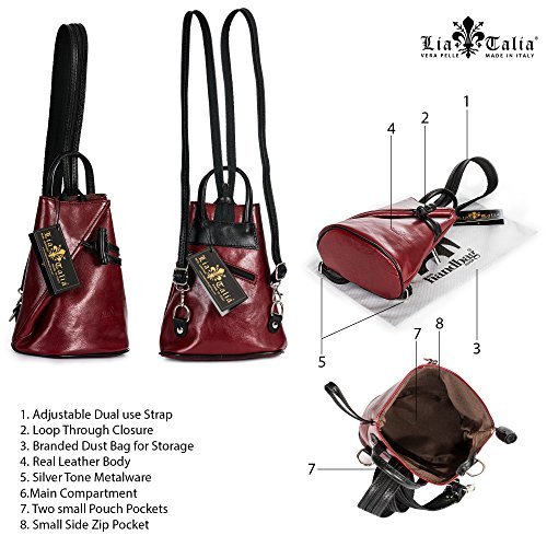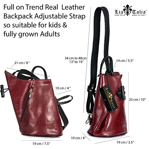 LiaTalia Branded Womens Cute Little Hand Made Genuine Real Italian Leather Backpack with a small top handle and adjustable and convertible twin straps with silver toned metal hardware Available in a standdard size and a cute little minismall size. There bags are more suitable as out and about bags to carry just some travel bits & should not be considered a full on backpackduffle bag.