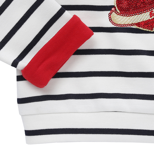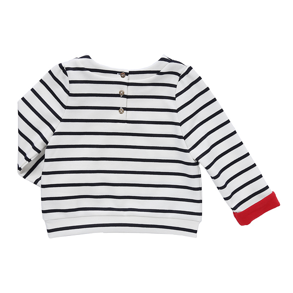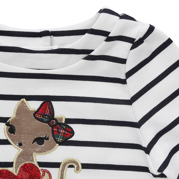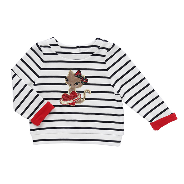 상품설명 네이비 스트라이프 티셔츠 입니다. 소매에 레드배색이 멋스러운 느낌을 주며 고양이와 하트 포인트가 러블리한 느낌을 더 합니다. 편안하게 입기 좋은 아이템입니다.