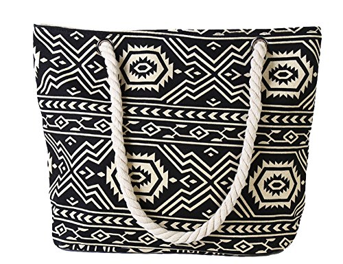 Pulama Womens Large Beach Tote Canvas Shoulder Bag Wave Striped Anchor Summer Handbag Top Handle Bag Straw Beach Bag (Black Geometry)