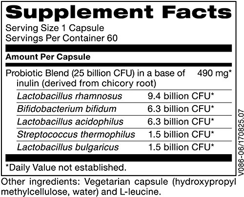 -. Feature : 25 billion CFU blend featuring 5 probiotic species to support GI colonization.* / Includes Lactobacillus rhamnosus, Lactobacillus acidophilus, Bifidobacterium bifidum, Streptococcus thermophilus, and Lactobacillus bulgaricus. / These transient and colonizing species have high tolerance to stomach acid and bile, which is important for maintaining viability in the intestinal environment.* / Hypoallergenic* product free of the following common allergens: milk/casein, eggs, fish, shellfish, tree nuts, peanuts, wheat, gluten, and soybeans. Contains no artificial colors, flavors, or preservatives. / Trusted by healthcare practitioners since 1969, Klaire Labs products are developed closely with physicians and are intended to be used as directed by a healthcare practitioner.