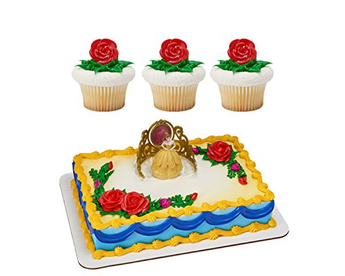 Disney's Beauty & The Beast BELLE Licensed Cake Topper by Decopac & 24 Red Rose Cupcake Ring Combo