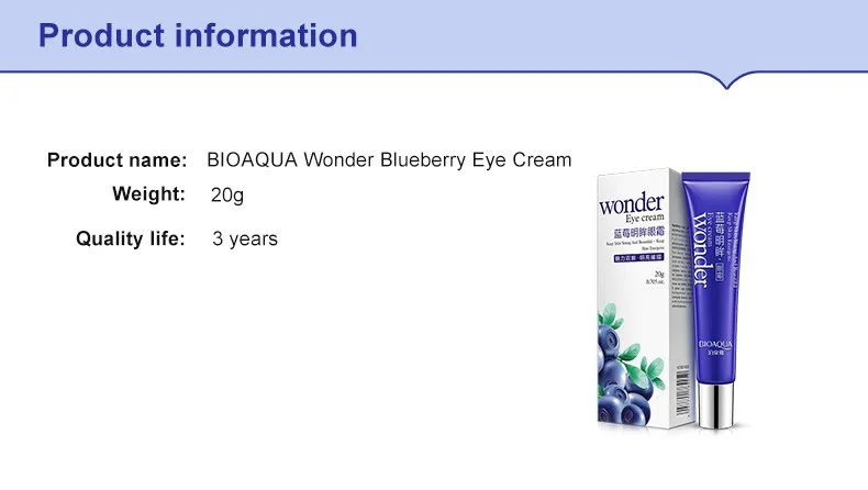 BIOAQUA Nature Wonder Blueberry Eye Cream About Product Natural Blueberry essence eye」ャ texture hydrogel and delicate」ャ soft and gentle. Easily penetrate and easily absorbed」ャ moisturize and nourish skin around eyes. Effectively firm fine lines」ャ eye bags and dark eye circles」ャ even out skin tone. Brand:BIOAQUA Net Weight:20g/0.7ounces Origin:China Ingredients:water」ャ glycerol」ャ polymethacrylate」ャ cyclic」ャ five polydimethylsiloxane」ャ hydrogenated polyisobutylene」ャ shea tree(BUTYROSPEREMUN PARKII) fruit butter」ャ isononyl isononanoate」ャ dimethicone」ャ yeast extract」ャ sodium acrylate/acrylic acid copolymer taurate」ャ narrow leaf bluebeffy fruit extract」ャ oat glucan」ャ sugar」ャ trehalose」ャ hydrolyzate」ャ bisabolol」ャ flavour」ャ methylisothiazolinone」ャ sodium hyaluronate. How to use:After cleansing and toning in the morning and evening」ャ take the grain size on the ring finger and gentle tap around the eyes. With gentle circular motions spread the cream. It's better use massage to help the skin asorbed. Note:Scour off with clean water if the product enters the eyes by accident. Stop using when the skin feels uncomfortable or allergy appears. Please placed in the children can't reach. The storage should be keep far away from fire and sunlight」ャ dampness and keep in seal. | |