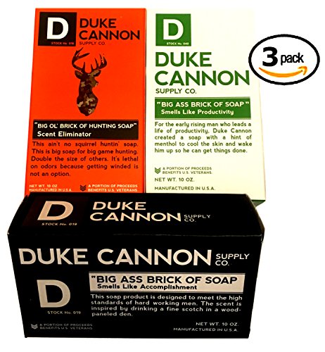 -. Feature : Mens Gift Set Includes 3 Big Bars of Soap / 1 Each Productivity, Accomplishment, and Hunting Brick Scent Eliminator ( Each Big Ass Bar is 10 oz ) / Unscented Hunting Soap is formulated to eliminate odors - serious hunters know you cant risk getting winded when tracking a trophy buck / IT'S TIME FOR MAN TO DEVOLVE, NOT EVOLVE. DUKE CANNON ISN'T FOR EVERYONE / QUITE FRANKLY, HE PREFERS IT THAT WAY. AFTER ALL, DUKE CANNON DOESN'T DINE WITH VEGANS AND HE COULD GIVE A DAMN / A DIFFERENT ERA WHEN MEN HAD A GREATER PURPOSE IN DUKE'S TIME, MEN PURSUED MEANINGFUL ENDEAVORS. THEY WORKED WITH THEIR HANDS. THEY TOOK P.R.IDE IN THE THINGS THEY BUILT, NOT THE THINGS THEY BOUGHT. AND THE MINDSET WAS SIMPLE: MEN WANTED TO WIN, NOT FIND THE "WIN-WIN". AND THEN THE WHOLE METROSEXUAL TREND CAME AND SCREWED MEN UP EVEN WORSE. NOW EXISTS A GENERATION OF MEN WHO HAVE SPENT MORE TIME IN A POTTERY BARN STORE THAN A HARDWARE STORE