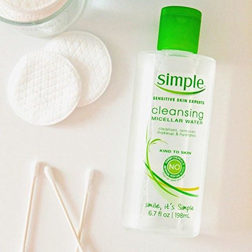 -. Binding : Health and Beauty -. Brand : Simple -. EAN : 0087300453842 -. Feature : Simple Micellar Cleansing Water is our most advanced facial cleanser to date, yet it is gentle on even the most sensitive skin / A complete and thorough skin cleanser, Simple Micellar Cleansing Water cleans the skin of dirt and impurities and unclogs pores - it is also formulated for makeup removal / Simple Micellar Cleansing Water instantly boosts skin hydration instantly by 90% / Pure cleansing water made with skin-loving ingredients and triple purified water to clean, refresh, and instantly hydrate all skin types / Simple Micellar Water contains no artificial perfume or dyes and no harsh chemicals so you can thoroughly clean your face and remove makeup with no skin irritation -. Label : Unilever -. Manufacturer : Unilever -. Model : 10087300453849 -. PackageQuantity : 1 -. ProductGroup : Pantry -. ProductTypeName : BEAUTY -. Publisher : Unilever -. ReleaseDate : 2015-07-09 -. Size : 6.7 Ounces -. Studio : Unilever -. Title : Simple Micellar Cleansing Water, 6.7 Ounce -. UPC : 087300453842