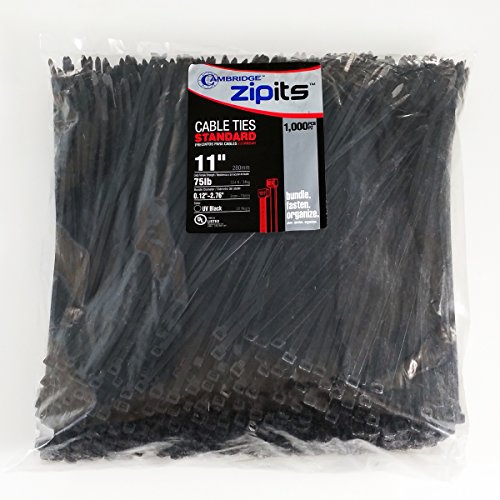 - Cambridge Zipits 11" 75 Lb UV Black Cable Ties- 1000 Pcs. Ideal for standard multi-purpose, bundling, cable management and organizational projects. These cable ties are easy to use and lock quickly and securely around wire bundles, cables, ropes and more.