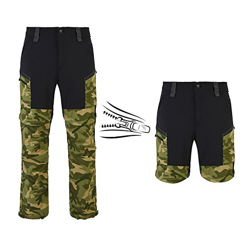 -. Feature : CONVERTIBLE- Bottom leg zips off to convert to a cooler shorts. Function perfectly as long-legged pants or shorts, allowing for a full range of motion / CAMO PATTERN- Hunting Camouflage Pattern, classic army green and blue color, completely different from other pants. Perfect for any occasion / BREATHABLE- Made of Nylon and single-yarn drill material repels water and wind, wicks away moisture and dries quickly for dry, cool comfort / ADJUSTABLE- Partial elastic waistband accommodates athletic thighs and hips. Cuff size can be adjusted by 4 buckles to fit comfortably / MULTI POCKETS- Straight-leg convertible pant with 4 side cargo pockets, 2 hand pockets, and 1 back zipped pockets gives you room to carry a few essentials. PLEASE CHECK THE SIZE CHART BEFORE PURCHASE