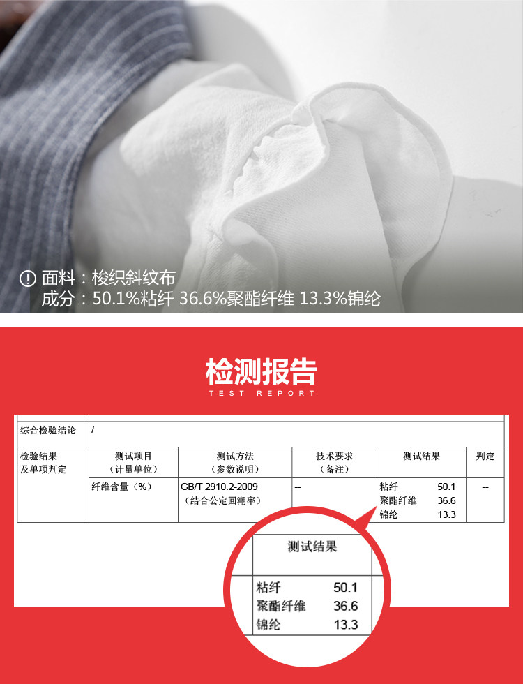 | 面 料:50.1%粘纤 36.6%聚酯纤维 13.3%锦纶 配料:91.6%聚酯纤维 8.4%粘纤颜 色:白色 |