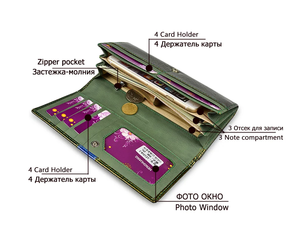 Interior:Photo Holder,Interior Zipper Pocket,Cell Phone Pocket,Zipper Poucht,Coin Pocket,Interior Compartment,Interior Slot Pocket,Note Compartment,Card Holder