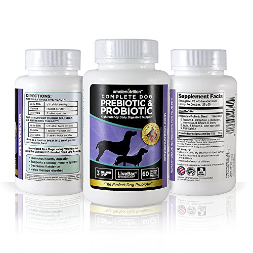 -. Feature : 100% NATURAL & SAFE - Our probiotic for dogs contains NO....meat, GMO, soy, yeast, wheat, or gluten, chemicals, preservatives, artificial flavors or colors. / HUMAN GRADE QUALITY - Made in the USA & packed with a guaranteed 3 billion (CFU) of the 10 carefully chosen probiotic strands plus one prebiotic booster will deliver a complete probiotic dog supplement. / PATENTED TECHNOLOGY - Our LiveBac delivery system Guarantees 50% of our probiotic bacteria will be alive at 18 months WITHOUT REFRIGERATION! / VETERINARIAN APPROVED & GUARANTEED - Formulated by veterinarians, we stand behind our product and expect nothing but the best results - If you aren't completely happy with our Complete Dog Prebiotic & Probiotic, return it for a complete refund! / OPTIMIZE YOUR DOG'S DIGESTION! We Have Carefully Chosen 10 Scientifically-Supported Probiotics And One Powerful Prebiotic! Aid in decreasing potentially harmful bacteria and pathogens in your dog's gut - Reduce gastro-intestinal discomforts such as gas or bloating - Improve bowel regularity and better stool - Use during times of stress (food changes, garbage eating, bouts of diarrhea, traveling, boarding, training) to support a healthy gut and immune system.