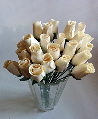 2 dozen (24) beautiful realistic ivory off-white wooden roses with green wire stems