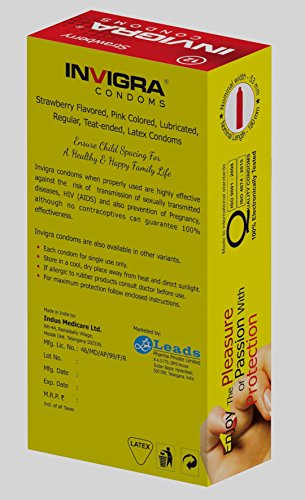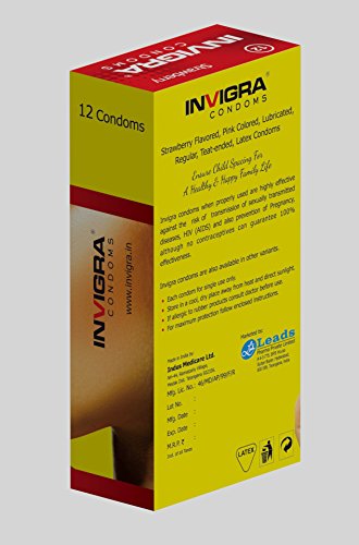 Studio : Leads Pharma Private Limited Publisher : Leads Pharma Private Limited Binding : Health and Beauty Product Description 12 Strawberry flavored, pink colored, lubricated, teat-ended, latex condoms. Invigra condoms when properly used are highly effective against the risk of transmission of sexually transmitted diseases, HIV(AIDS) and also prevention of pregnancy, although no contraceptives can guarantee 100% effectiveness. Invigra Condoms are also available in other variants. ? Each condom for single use only ? Store in a cool, dry place away from heat and direct sunlight ? If allergic to rubber products consult doctor before use ? For maximum protection follow enclosed instructions 0