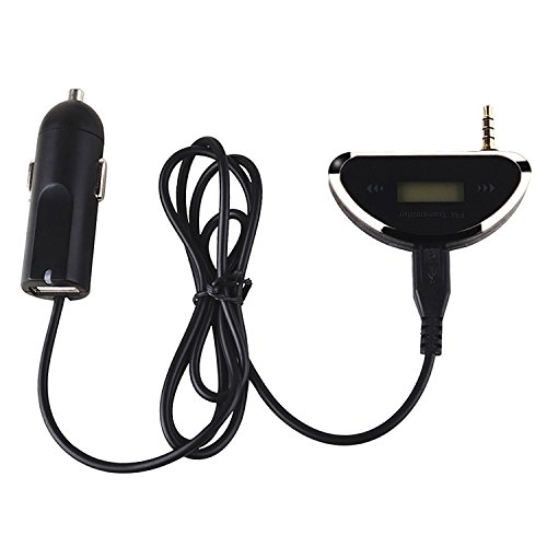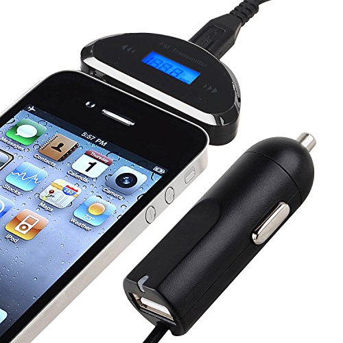 - Feature : Portable device to broadcast music from your iPod®, PDA, MP3 or CD player to your car / home FM radio. Easy to read LCD frequency display. Just plug the FM transmitter into the headphone jack of your MP3 player or any other audio source with a standard 3.5 mm jack size. / All frequency tuning allows endless selection of radio frequencies from 88.1 to 107.9 Mhz with an increment of 0.1 Mhz. Powered by car cigarette lighter adapter (Included). / Frequency range: 88.1 - 107.9 MHz. USB Output: 5V 1A. Color:Black. Includes: FM Transmitter. 12V Car Cigarette Lighter Power Adapter. / Accessory Only, Device not included.