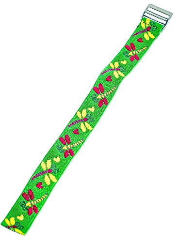 -. Feature : Dragonfly & Hearts Design. / 16mm Adjustable and Washable Elastic Fabric Strap. / Perfect for little wrists - comfortable too - Safety Stainless Steel Silver Clasp. / Length from end to end = 8 inches = 20 cm = 200 mm. However, this watch band is made out of elastic, which means that it can stretch to accommodate larger adult wrists comfortably. / The elastic band makes it easy on and off, but not so much that it will slide off by itself. In addition to fitting on Timex Youth watches, this strap can practically fit on any watch measuring 16mm at the end lugs, and it is long enough that an adult can wear it comfortably.