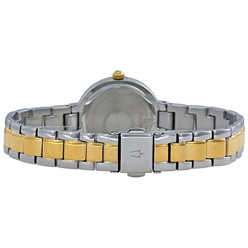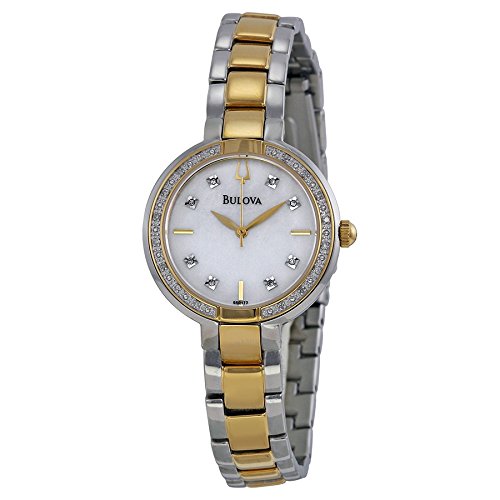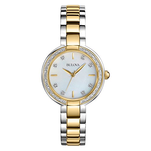 Sleek and sophisticated, this ladies' Bulova watch features a round mother-of-pearl dial with gold-tone hands and diamond accent hour markers in a two-tone stainless steel case with a diamond accented bezel. The reliable Japanese quartz movement ensures accurate time keeping. This watch is water-resistant up to 30 meters and the polished two-tone stainless steel link bracelet secures with a fold-over clasp. Case size: 29 mm.