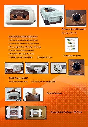 Studio : NEOMEDIC Publisher : NEOMEDIC Binding : Health and Beauty Product Description * 4 Chamber Sequential Compression Therapy Pump ONLY. , 220V machine available, ship to worldwide, Made in U.S.A. FDA Medical Device Cleared. * Gradient Squeezing Compression Mode (Proven to be the Best for Blood, Lymph Circulation Therapy. Pressure: 20 ~ 100 mmHg, 60 min Timer), Quick Easy to use Connector w/Safety Lock System * The "Squeeze" in a graduated compression is most firm at the bottom and reduces toward the top of the garment like human body. * Lymphedema, Edema, Chronic Venous Insufficiency, Varicose Vein, Wound Therapy caused by poor blood circulation, Tired, Swollen, Aching feet, legs. * 15 sec inflation / deflation per chamber one after another 0