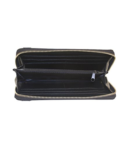 - Feature : Zip-around closure with decorative gold ornamentation. Card slots, note compartment and zippered coin pocket at wallet interior. Fully lined. / Wallets measure between 8-8.5"Wide; 4-4.5"High; 1"D / Texture faux-leather for long lasting wear