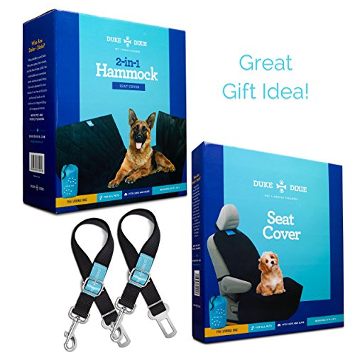 -. Title : Dog Car Seat Covers and Dog Seat Belt Kit - 1 Hammock Style Backseat cover Protector, 1 Bucket Seat Cover , 2 pack pet Seat Belt Leashes - Bonus Storage Bags - by Duke & Dixie