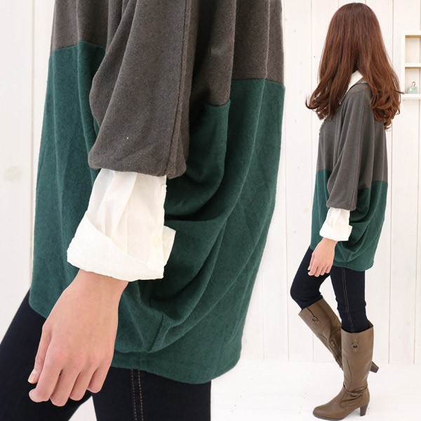 薄手ニットソーでザックリ着れる バイカラードルマンスリーブワンピース