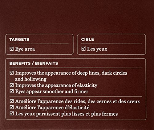 An advanced and intensive anti-aging eye treaent. Contains a unique Neuro-oligopeptide Complex to firm and repair aging skin. Visibly reduces the appearance of deep lines. wrinkles. puffiness. discoloration and dark circles. Restores skin's tone and elasticity while delivering moisture. Unveils a firmer. smoother. more vibrant and younger looking eye zone.Feature