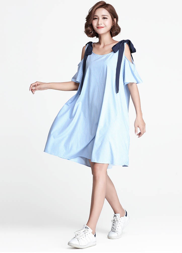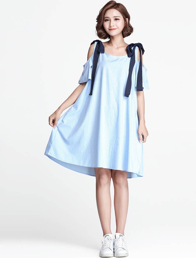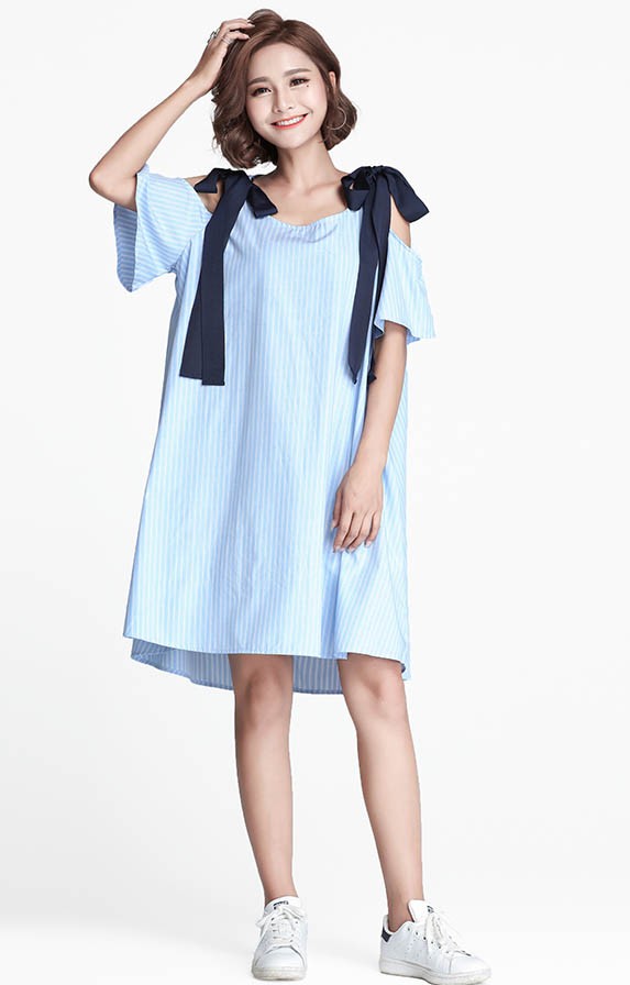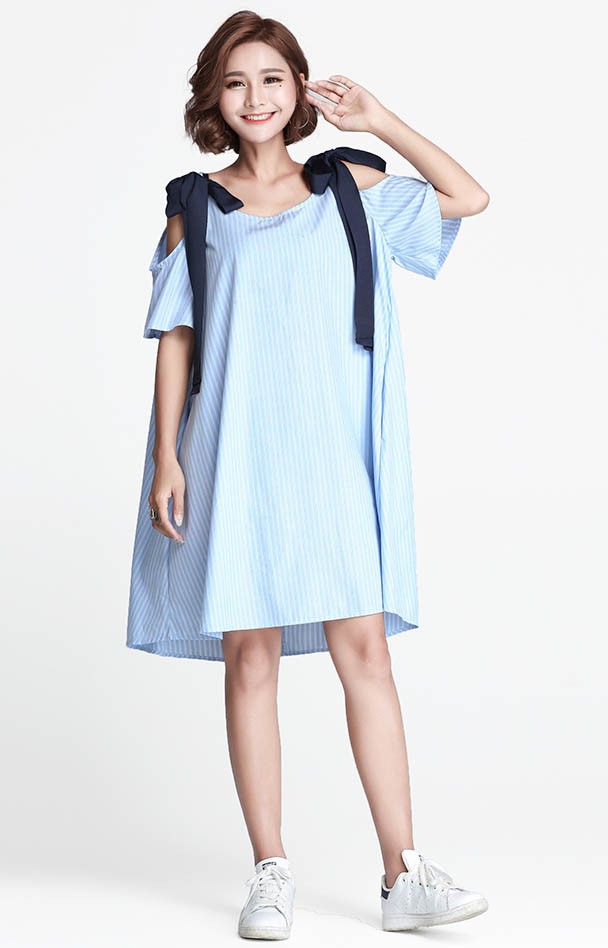 【入荷後営業日2,3日以内出荷予定 通関待ちや不良により出荷遅くなる場合はメールにてご連絡いたします。メール受信設定によっては正常に受信されない場合はございますので、 弊社からのメールを予め受信頂くようご設定くださいませ。】 ワンピ ワンピース Aラインワンピ チュニックワンピ ドロップショルダー リボン ゆったり レディス レディース 春 新作 2018ストライプ柄ドロップショルダーゆったりAラインワンピ◆サイズ:着丈89胸囲110◆素材:コットン、ポリエステル