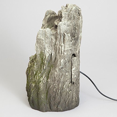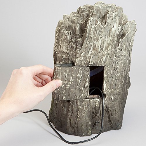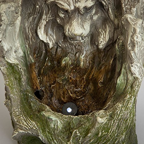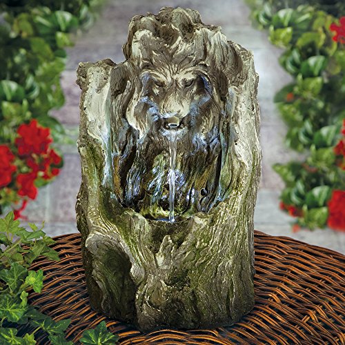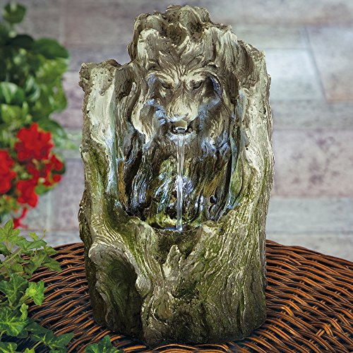 A majestic lion's head emerges from the faux wooden tree with an LED accent light that highlights the water as it cascades from his mouth into the trunk below.