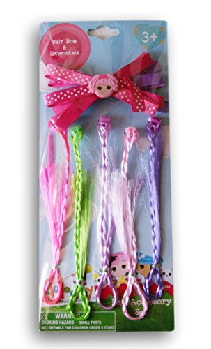 Have a ball dressing up with this LaLaLoopsy-themed hair accessory set! Each order one LaLaLoopsy bow decked out with ribbons, as well as 5 hair extensions, all different colors, pre-braided, with mini claw clips for easy use.Feature
