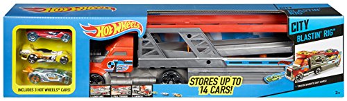 -. Binding : Toy -. Brand : Hot Wheels -. EAN : 5711008977243 -. Feature : Haul 'em and Race 'em! / Kids can haul their cars around and send them flying on a high-speed race with this cool transporter that includes a built-in, kid-powered launcher / With room for up to 14 Hot Wheels vehicles, take their favorite Hot Wheels cars wherever you go! / Includes three Hot Wheels vehicles so the fun starts straight out of the box / A great gift for any Hot Wheels collector -. IsAdultProduct : 0 -. ItemPartNumber : CDJ19 -. Label : Hot Wheels -. Manufacturer : Hot Wheels -. Model : CDJ19 -. MPN : CDJ19 -. PackageQuantity : 1 -. PartNumber : CDJ19 -. ProductGroup : Toy -. ProductTypeName : TOYS_AND_GAMES -. Publisher : Hot Wheels -. Studio : Hot Wheels -. Title : Hot Wheels City Blastin' Rig -. UPC : 755187047156 -. Warranty : 1 year warranty against manufacturer defects