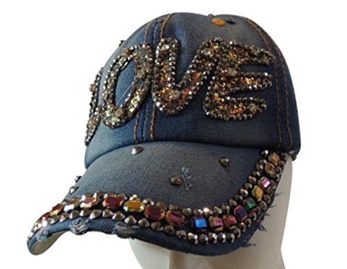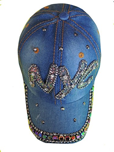 -. Feature : Brighten up any outfit with this totally bling rhinestone studded baseball cap. Great for summer or any season. / Choose from three different shades of denim - light blue, medium blue, or dark blue. / Choose from three different designs - NYC, Baby, Love, or Kiss. / 100% Cotton / Adjustable buckle for a one size fits most fit.