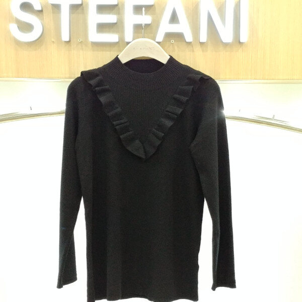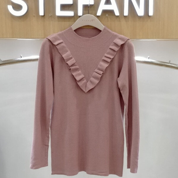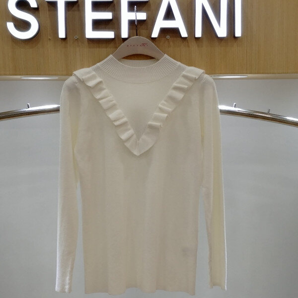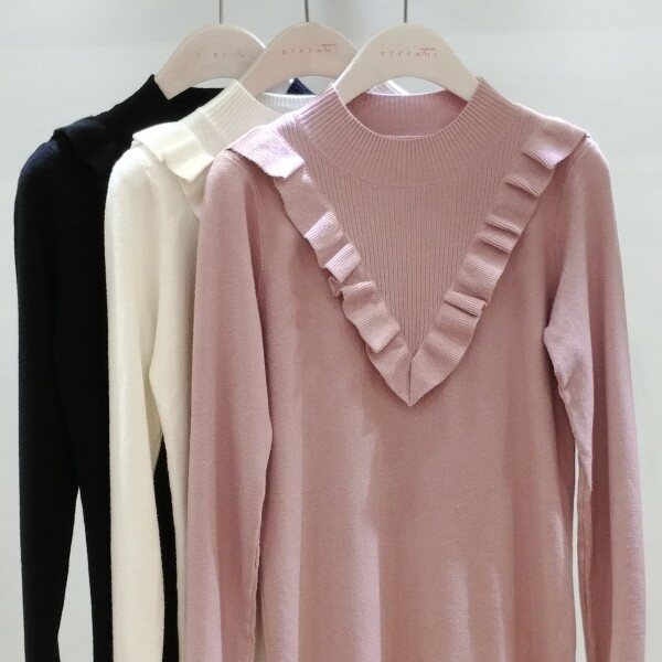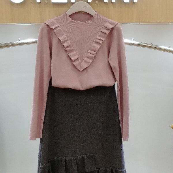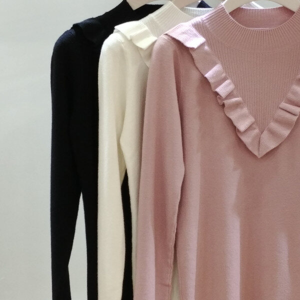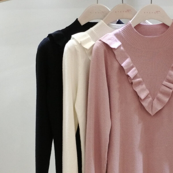 브이로 떨어지는 프릴 디테일로여성스런 반목니트부드러운 촉감으로 착용감이뛰어나며 신축성이 좋아편안해요스커트.슬렉스,데님등에 매치하기 좋은 아이템이예요