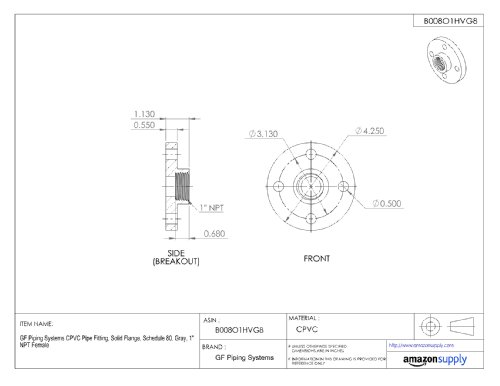 Meets ASTM D1784 and F441 standards for quality assurance, meets NSF standards 14 and 61 for potable water service, and has a Class 150 bolt pattern per ANSI standard B16.5