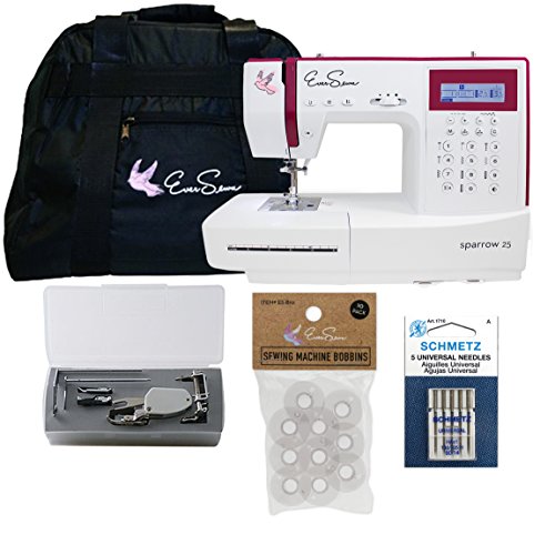 -. Feature : The computer-controlled EverSewn Sparrow 25 is the top model in the Sparrow series. / It offers everything a creative sewer could need, at a very attractive price/performance ratio. / The Sparrow 25 boasts 197 stitch patterns in total, including 1 alphabet, 7 buttonholes, and 1 eyelet stitch. Decorative stitches can be set up to a width of 7 mm, as desired. The memory function allows individual stitch combinations to be saved. In addition to features such as the slide speed control, start/stop function and needle stop up/down. / Quilting Bundle Includes: EverSewn Sparrow Sewing Machine Tote, EverSewn Sparrow Quilting Kit, EverSewn Sewing Machine Bobbins 10 Pack, Schmetz Universal Needles - Size 90/14.