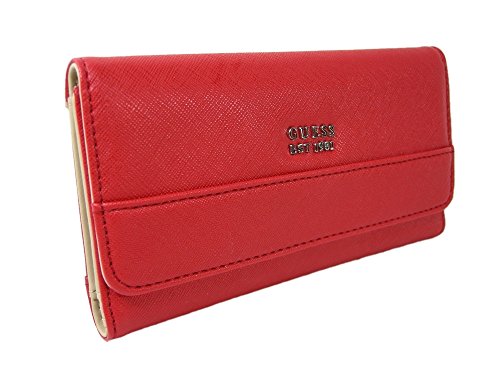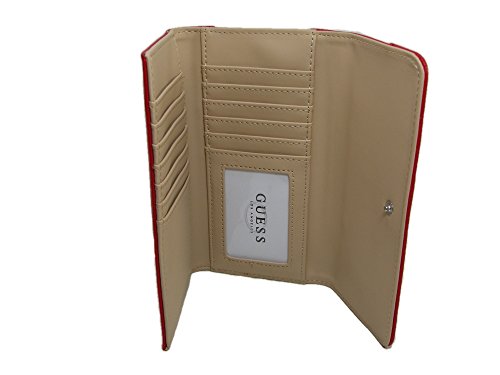 Product Description Red exterior with the Guess logo in silver. It measures 7 inches by approximately 4 inches. ?The interior contains an ID window, 12 credit card slots, and 3 larger slip pockets.? The back of the wallet also has an exterior zipper pocket.? Tag Information: Style No.:? VY684651 Name:? Weldon Slg Color:? Red 0