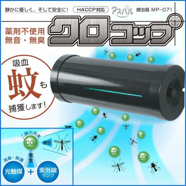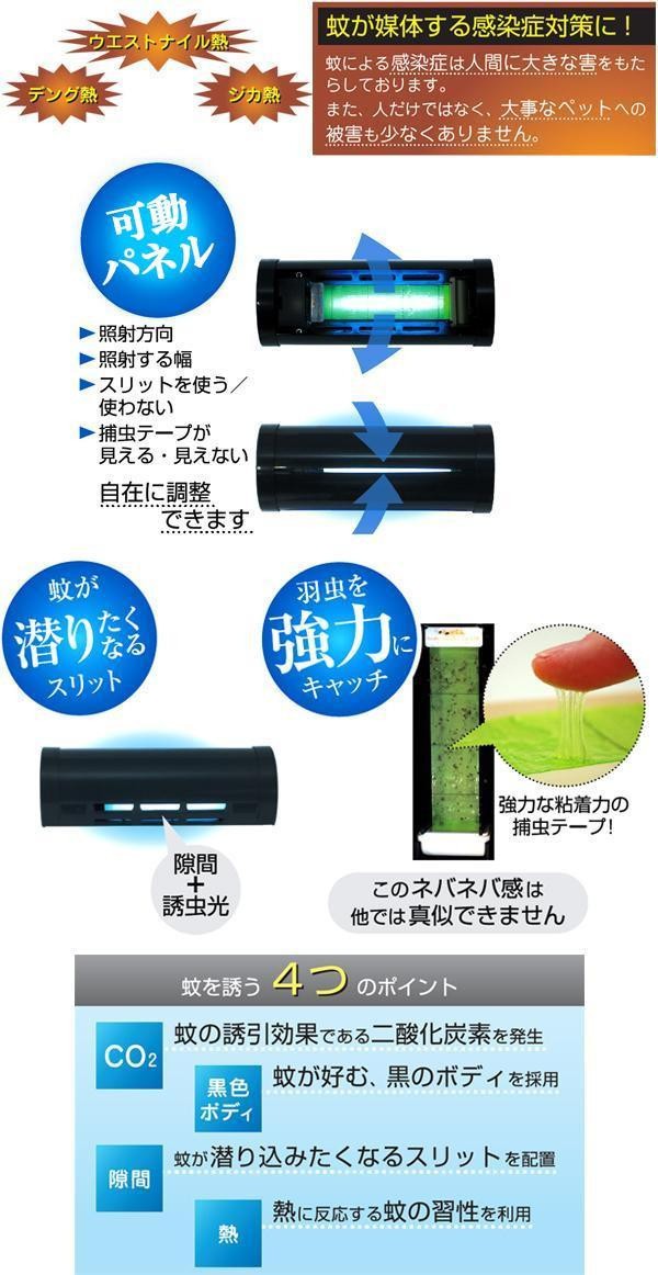 | 虫の好む光で飛来昆虫を呼び寄せ、強力な粘着テープで捕獲。蚊の誘引効果である二酸化炭素を発生させ、熱に反応する蚊の習性を利用。更に、蚊が好む黒色のボディを採用し、蚊が潜り込みたくなるスリットを配置しました!この蚊を誘う4つのポイントで捕獲量UP★ |