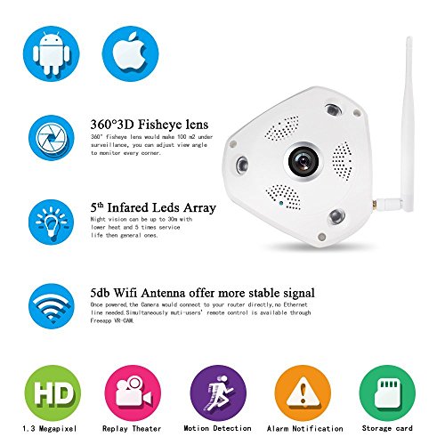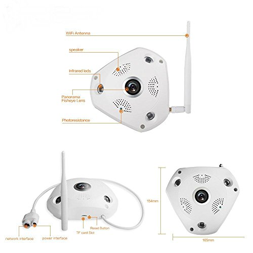 -. Feature : This WIRELESS WIFI Camera supports Android/Computer/Tablet ,HD 960P ,IR-CUT Day/Night Version ,Dual Stream ,Two Way Audio , Motion Detection,Mobile Surveillance. / Built-in Fisheye Lens provides 360 Degree Panoramic Image which is no blind spot ,one camera equals to four cameras,you will experience REAL PANORAMIC IMAGES. / you can use it for Family Monitor,Pet Care,Child&Aged Care,Store Surveillance and Company Supervisor. / 360 Degree panoramic Range view with 1.2mm Fisheye Lens,1 camera covering whole room / Both android and iPhone are supported. Download app to your phone by QR code.