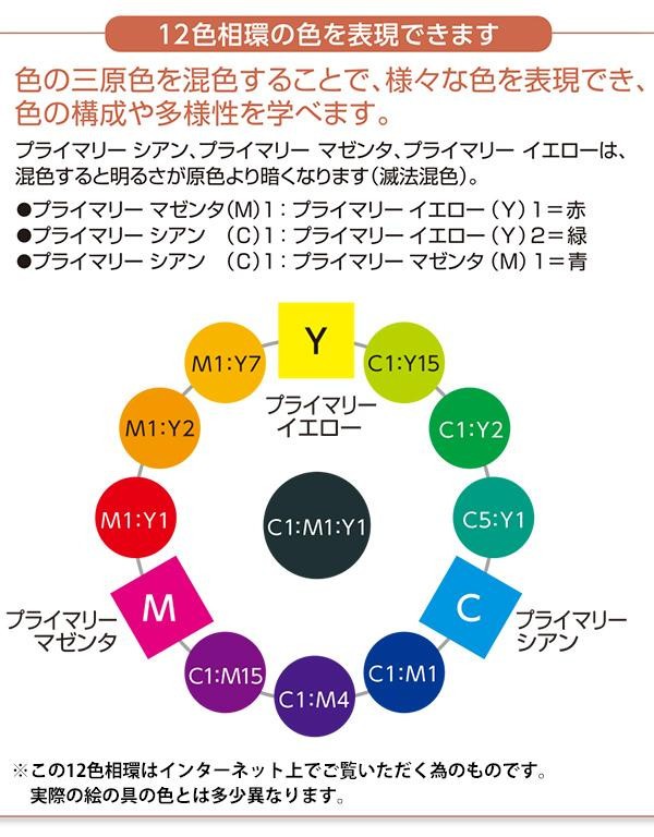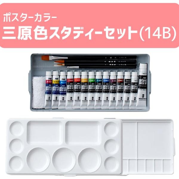 ムラなくきれいに塗れる、ポスターカラー。あざやかでマットに仕上がり、ナキ・にじみもありません。描きやすさで、広く愛されています。混色に適した三原色が入った、スタディーセットです。 |