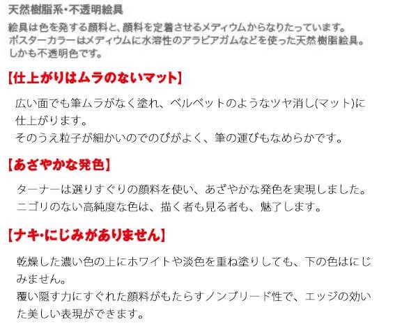 | ムラなくきれいに塗れる、ポスターカラー。あざやかでマットに仕上がり、ナキ・にじみもありません。描きやすさで、広く愛されています。混色に適した三原色が入った、スタディーセットです。 |