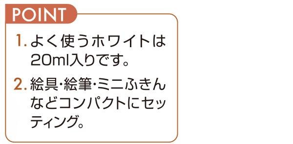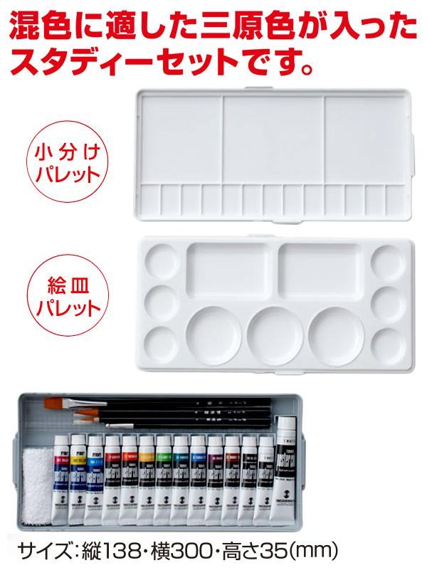 | セット内容 | Wパレット付ケース、黒軸デザイン筆(面相筆・彩色筆・平筆)×各1、黒軸棒、アクリル製ミゾ付定規(25cm)、ミニふきん 【絵具】 10色(11ml/17 カーマイン、12 バーミリオン、5 イエローディープ、21 ライトグリーン、25 ビリディアン、32 コバルトブルー、43 モーブ、52 バーント シェナー、58 ブラック、1 ホワイト)×各1 1 ホワイト(20ml)×1 三原色(11ml/901 プライマリーマゼンタ、902 プライマリーイエロー、900 プライマリーシアン)×各1 |