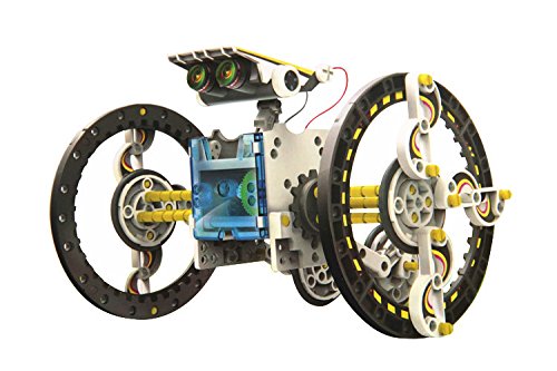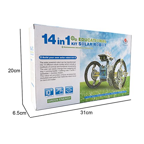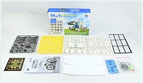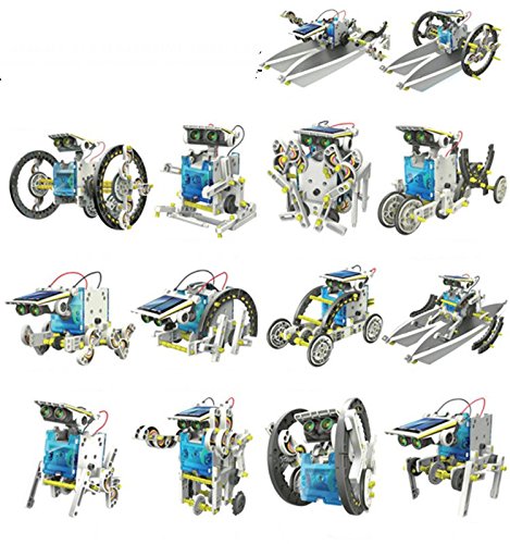 -. Feature : This solar powered robot kit can be transformed into 14 different modules / The robot modes include vehicles and bugs all in cartoon comic robot style / Movement is powered by solar panel and speed is determined by the intensity of sunlight it receives / There are two levels in building the robot kit, level one include: Turtle-bot, Beetle-bot, Quadru-bot, Boat-bot, Walker-bot, Dog-bot and wheel-bot / After they amuse themselves with the entry level, can challenge their manipulative skills with second level: Roly Poly-bot, Auto-bot, Slither-bot, surf-bot, Zombie-bot, Crab-bot and Row-bot With 14 in 1 Educational Solar Robot Kit, the kid can learn about the renewable energy sources and green technologies when they are having fun